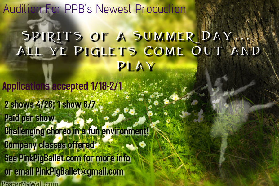 Audition dates are 1/18-2/1. Please submit a headshot, résumé and/or curriculum vita to Valerie at pinkpigballet@gmail.com for an invitation/more information.