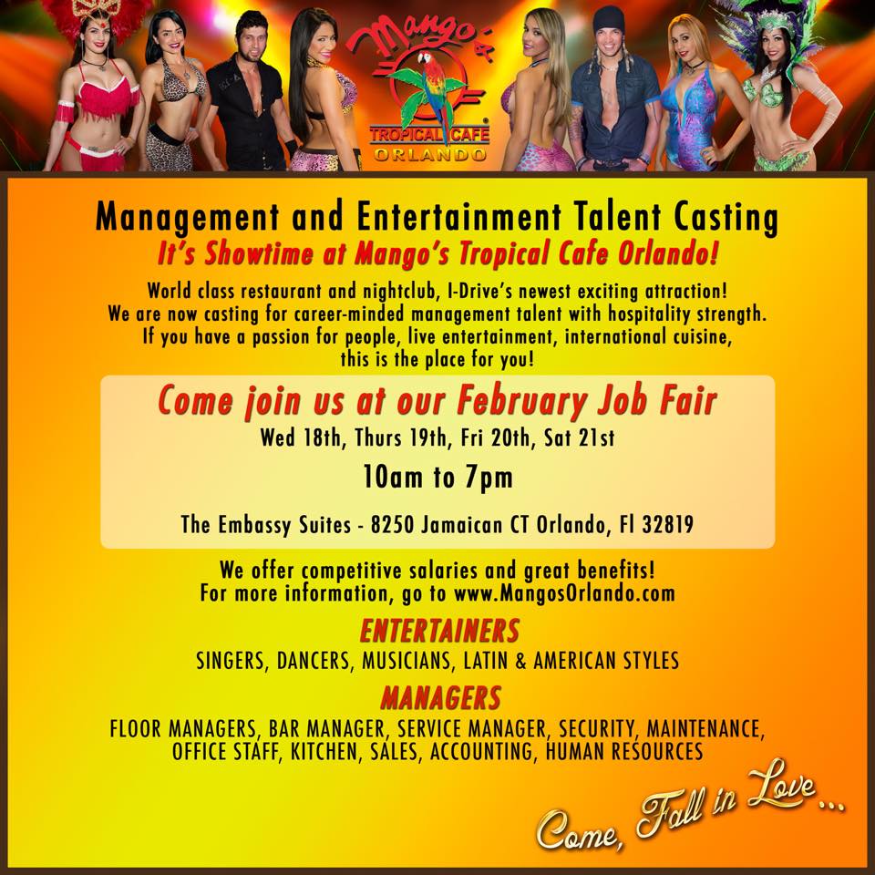 Management and Entertainment Casting is seeking trained dancers for “It’s Showtime at Mango’s Tropical Cafe” in Orlando Florida. The company is seeking salsa, samba and conga dancers as well as some hip hop acts and dancers for a Michael Jackson tribute.