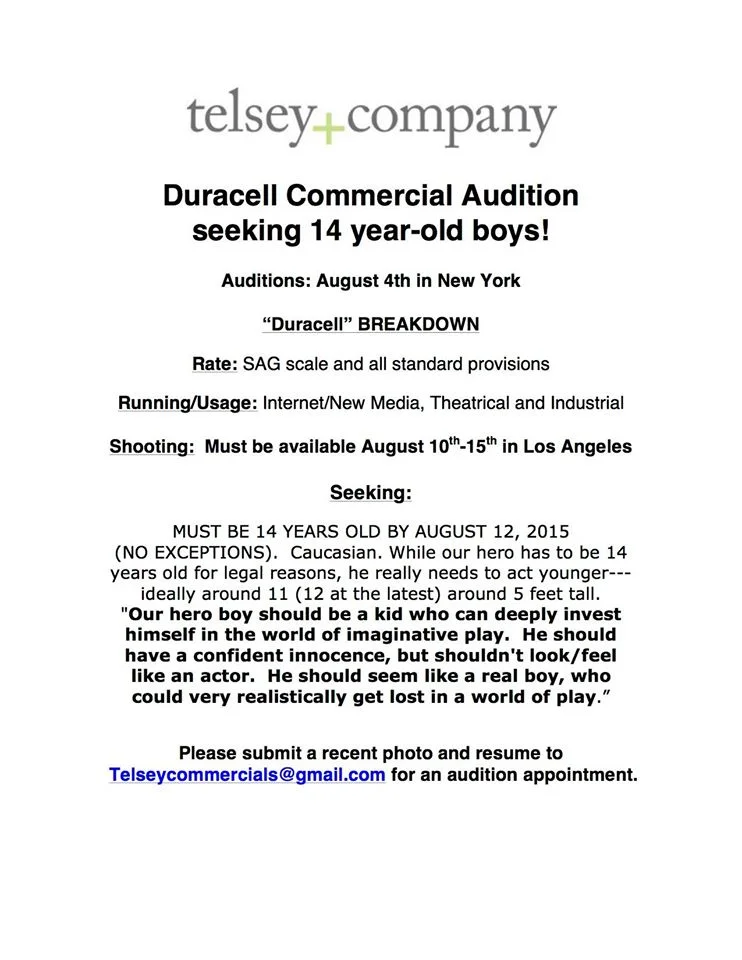 Telsey & Company Casting in NYC will be holding auditions this week for a 14 year old boy to be featured in a Duracell commercial filming later this month. Ideally, the casting directors are seeking a 14 year old boy (must be 14 for legal reasons) who looks younger, 11 or 12 years old. The boy should be Caucasian and around 5 feet tall.