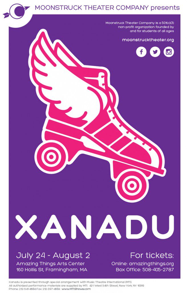 Moonstruck Theater Company is pleased to announce auditions for their 15th mainstage production, XANADU! Based on the cult-classic Olivia Newton-John film, XANADU follows the journey of a magical and beautiful Greek muse, Kira, who descends from the heavens of Mt. Olympus to Venice Beach, California in 1980 on a quest to inspire a struggling artist, Sonny, to achieve the greatest artistic creation of all time – the first ROLLER DISCO! But, when Kira falls into forbidden love with the mortal Sonny, her jealous sisters take advantage of the situation and chaos abounds.