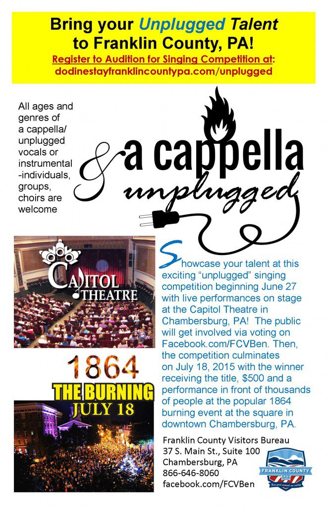 Bring your talent to Franklin County PA! Chance to win $500 first prize and perform in front of thousands at 1864: The Burning on July 18. Join the Capitol Theater and the Franklin County Visitors Bureau for auditions on June 23-24 and A cappella & Unplugged on June 27. Register today @ DoDineStayFranklinCountyPA.com/unplugged or call us at 866-646-8060.