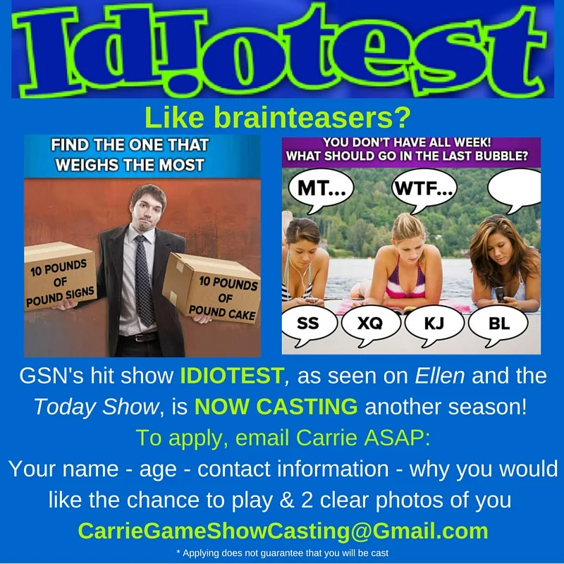 Game Show Network’s hit show IDIOTEST, as seen on Ellen and the Today Show, is NOW CASTING energetic, expressive, outgoing teams of 2 or 4 in the Southern California area who are ready to laugh and have a good time!