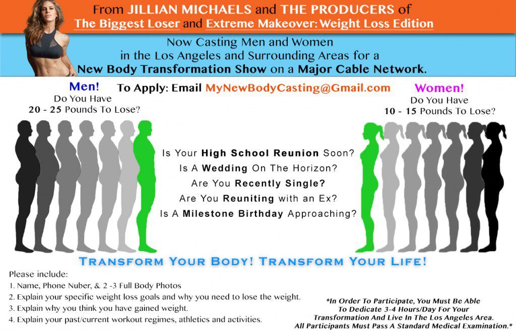 Fitness expert Jillian Michaels is working on a new fitness challenge / body transformation TV series and is currently casting people in the Los Angeles area who have a few pounds to lose. The show is being created by the folks behind “The Biggest Loser” and “Extreme Makeover:Weight Loss Edition“.