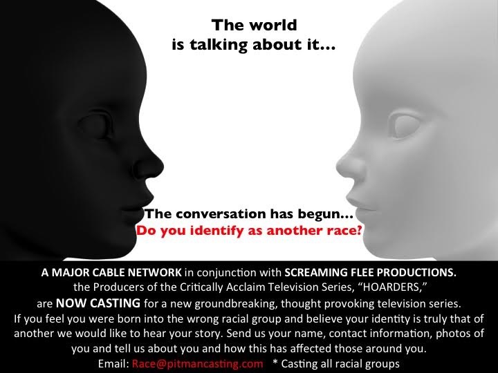 Do you identify with another race from your own? Do you feel like you were born into the wrong skin? Have you done drastic measures to change your appearance? Huge network is casting a new Docu-Series that films in September for one week. GREAT PAY! If interested fill out an application and put Nasche at the bottom so I can contact you for an audition.
