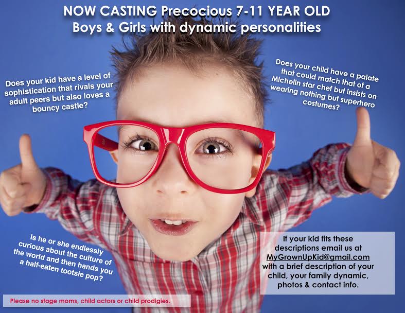 If your 7-11 year old fits the above description, please email us at mygrownupkid@gmail.com with a brief description of your precocious child, your family dynamic, photos and contact information.