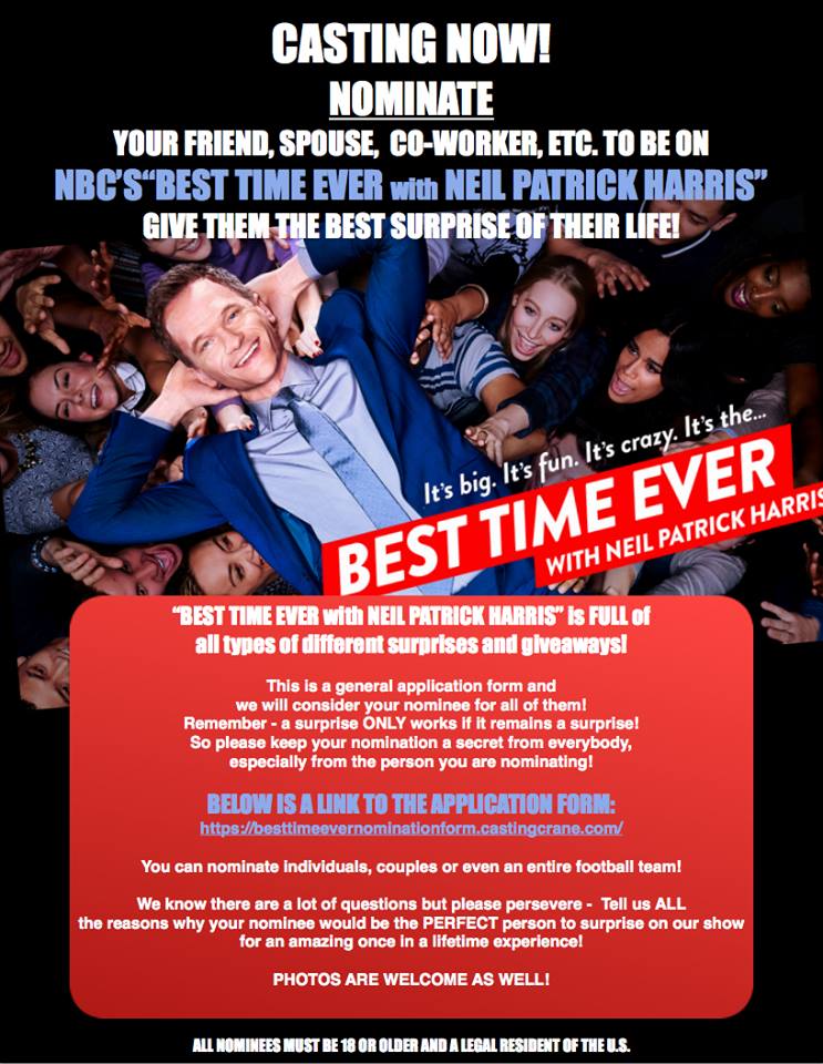 Do you know someone who deserves a surprise of a lifetime? NBC’s new show, NBC’s Best Time Ever With Neil Patrick Harris is now accepting nominations. You may nominate an individual, a couple or even an entire team!