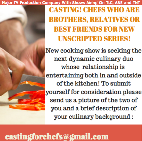 Major TV Production Company is seeking Chefs who are brothers, relatives or even best friends for a new unscripted cooking series!