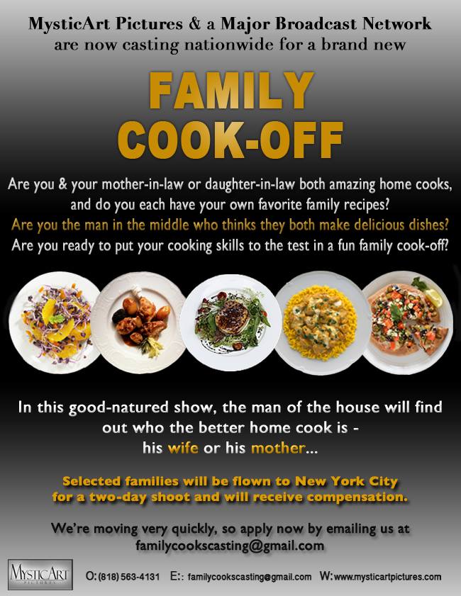 NOW CASTING! MysticArt Pictures and a Major Broadcast Network are now casting nationwide for a brand new show entitled, “Family Cook-Off.”