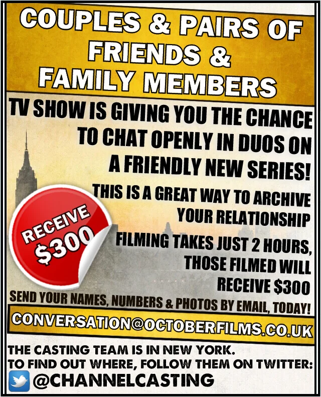 Casting a new TV series Looking for Couples – Friends – Siblings – Mothers and Daughters. It’s for a major US network that gives you the chance to step into a room and ask loved ones questions you’ve always wanted to. It’s all about honesty, intimacy and openness, an opportunity to be upfront & real with one another. We have 2 days left till casting closes. If you are interested and live in New York, we’re paying $300 per pair for a 2 hour shoot next weekend in NY, we’re also covering transport.