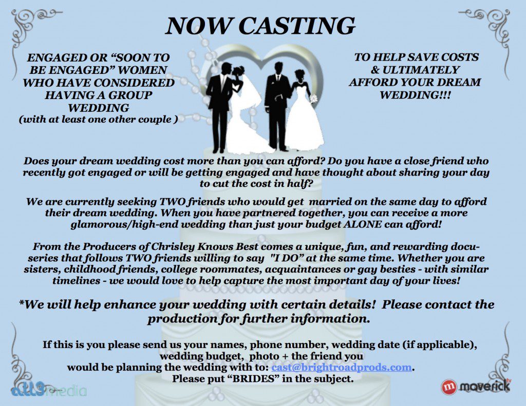 We are looking for 2 or more couple who have thought about or are currently planning on getting married at the same time! Not only can you can cut the cost but you can still afford your DREAM wedding!