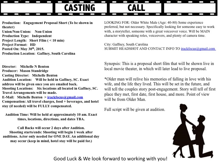 A short film about a wedding proposal is seeking an older white male actor ages 40 to 80 for the speaking, lead role. The role is paid and the project will shoot around the Gaffney, South Carolina area. The movie will be shown in a movie theater after which there will actually be a live proposal.