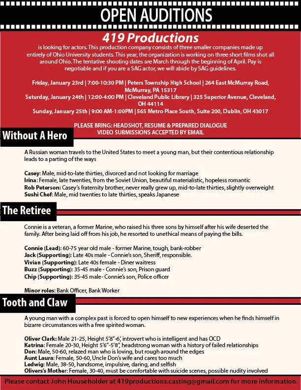 We are 419 Productions – an organization from Ohio University that shoots multiple narrative short films each Spring. We are currently in pre-production for three productions with different crews: Without a Hero, The Retiree, and Tooth & Claw.