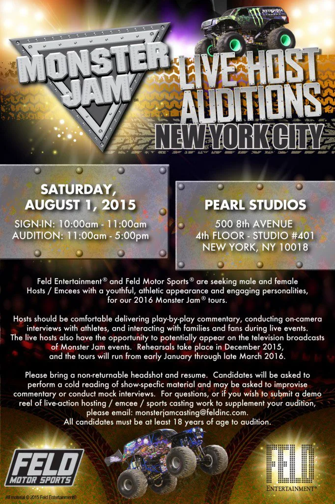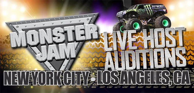 The touring Monster Jam Live! monster truck show will be holding auditions for show hosts and emcees in New York City and Los Angeles shortly. The show’s producers are seeking male and female hosts, ages 18+, with a youthful, athletic look that are able to deliver play by play commentary, conduct on camera interviews with drivers, teams and other athletes as well as interact with fans during the live or televised events. The show is casting for the 2016 tour / season and rehearsals will begin this coming December. The show begins in January 2016 and runs through March 2016.