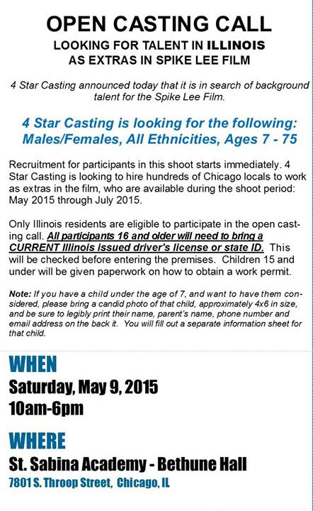 Whatever the title may end up being… the film is beginning production in the Chicago area later this month and there is an open casting call scheduled. Chicago residents looking for a chance to be part of the Spike Lee film can come out to Sabina Academy next Saturday for a chance to be cast in the movie. Casting directors for the project are looking for Illinois based background talent to fill many small roles in the upcoming production. They are casting men and women of all ethnicities between the ages of 7 and 75. The movie is scheduled to begin filming this month and will be in production through July.