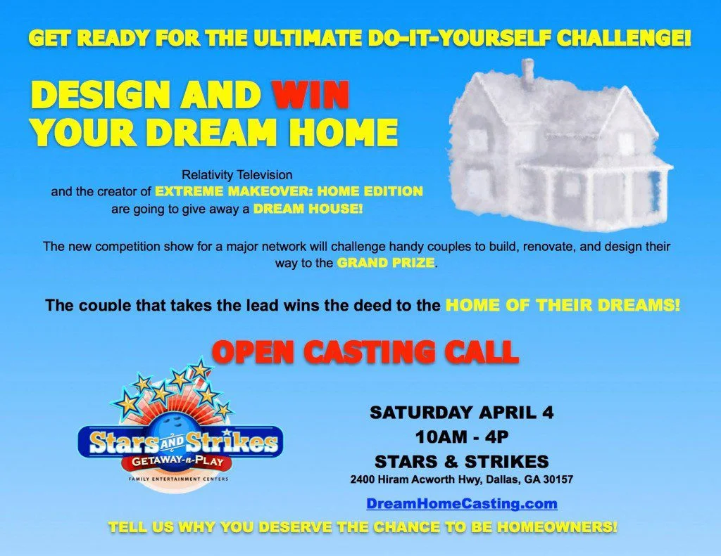 Major TV production company, Relativity Television… The folks who created “Extreme Makeover: Home Edition” are casting for a brand new show and will be hosting an open casting call in the Dallas / Atlanta, Georgia area this weekend. The show is seeking couples who are available to do a 9 week commitment on a TV series and couples must NOT own their own home. If you live in the Dallas, GA area and are ready to design your dream home…. here you go.