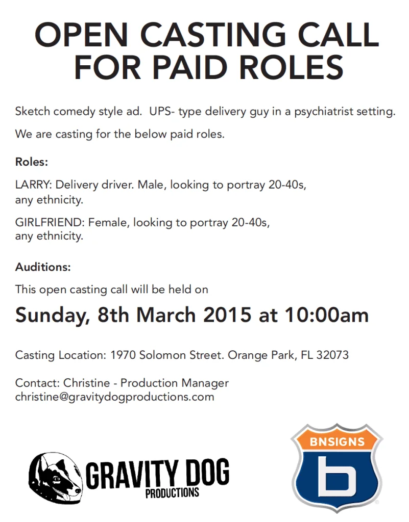 Please submit to: christine@gravitydogproductions.com by 2015-03-09