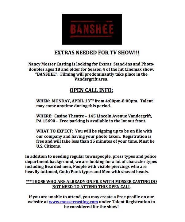 Cinemax series “Banshee” now casting many background actors in the Pittsburgh PA area. Open Call Today!