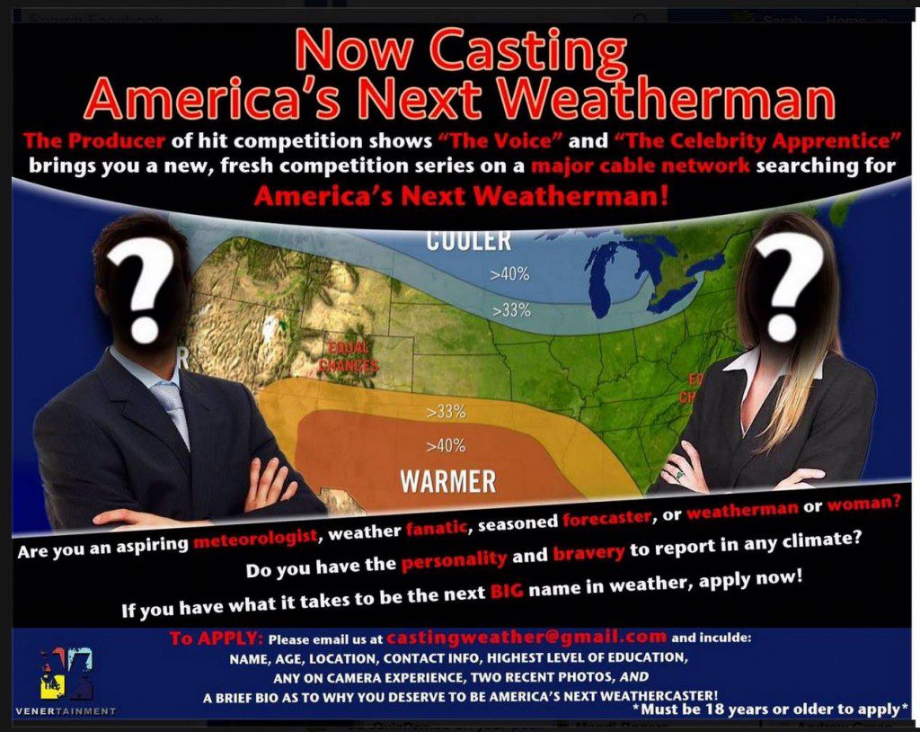 Contact us for your chance to be on a major cable network! E-mail castingweather@gmail.com and put: “Attn: Mandi” in the subject line! Details on flier.