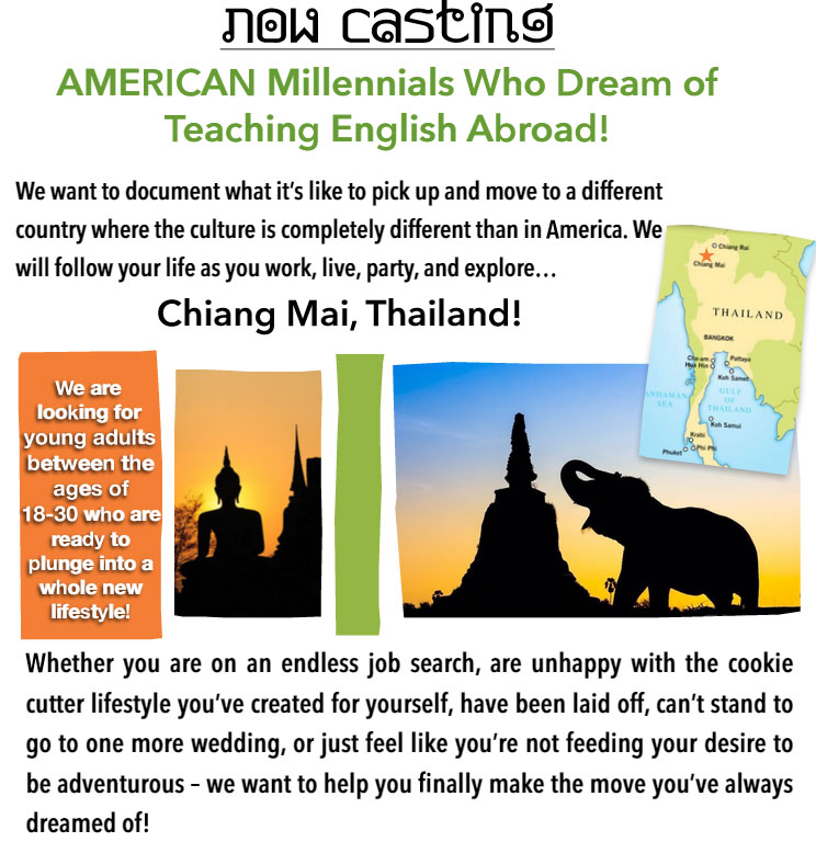 We are casting a new TV show all about young adults who are ready to plunge into a whole new lifestyle! We want to document what it’s like to pick up and move to a different country where the culture is completely different than in America. We will follow your life as you work, live, party, and explore Chiang Mai, Thailand!
