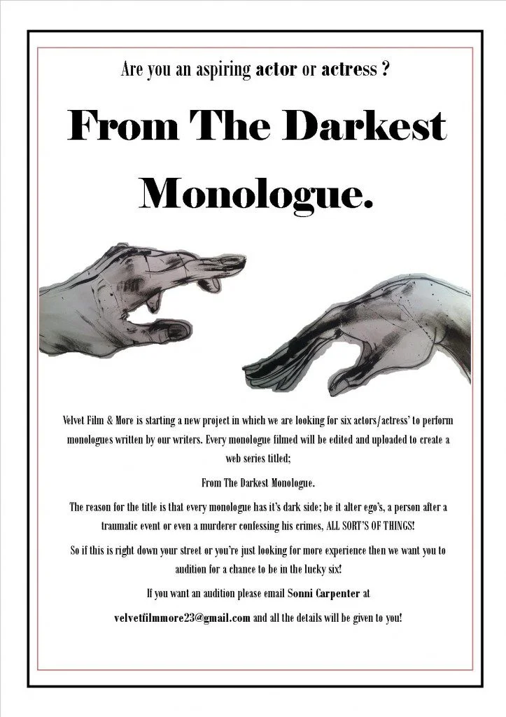 Velvet Film & More is looking for six actors/actress’ to act in a small web series, in which each episode is a monologue written by our writers. Each monologue has a dark side, hence the title, for example we have monologues based on alter ego’s, traumatic events, confessing criminals, all sorts of things.