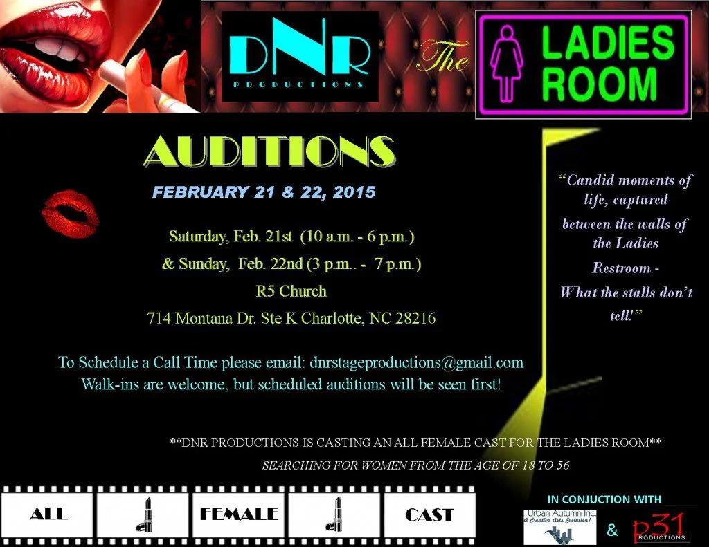 DNR Productions a collaboration of PXXXI Productions (www.proverbs31theater.com) and Urban Autumn, Inc.(urbandautumninc.com) are casting for an all-female cast for a the stage play, “The Ladies Room“! The Ladies Room is a compelling new stage-play drama which vividly depicts fleeting life-moments unveiled in the confines of a lady’s restroom located within Washington, D.C.s, trendy Silver Domino Bar & Lounge!