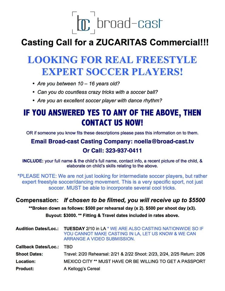 There is a nationwide casting call out for a Kellog’s Zucaritas TV commercial spot – soccer kids