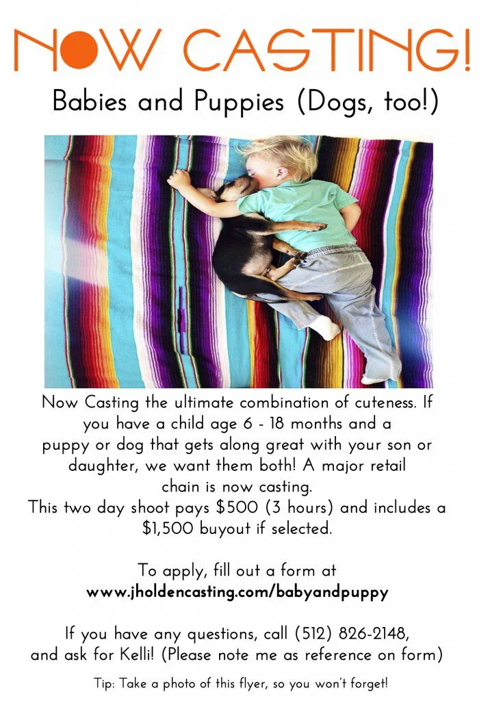 Now Casting the ultimate combination of cuteness. If you have a child age 6 – 18 months and a puppy or dog that gets along great with your son or daughter, we want them both! A major retail chain is now casting.