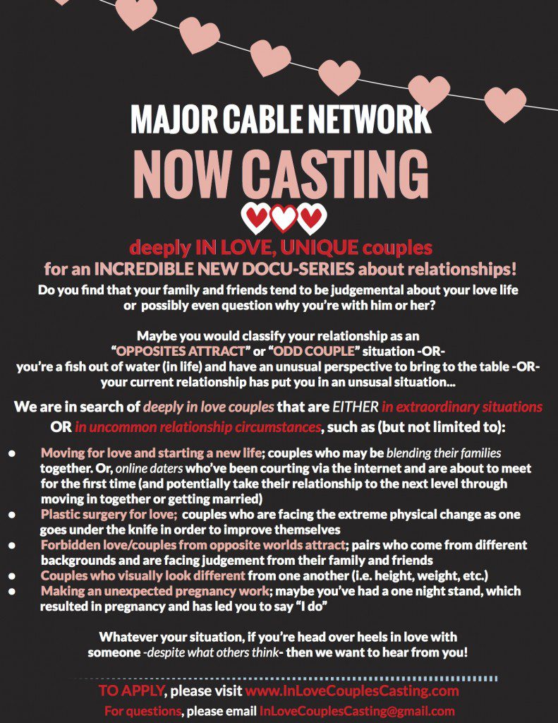 MAJOR CABLE NETWORK is NOW CASTING deeply in love UNIQUE COUPLES!