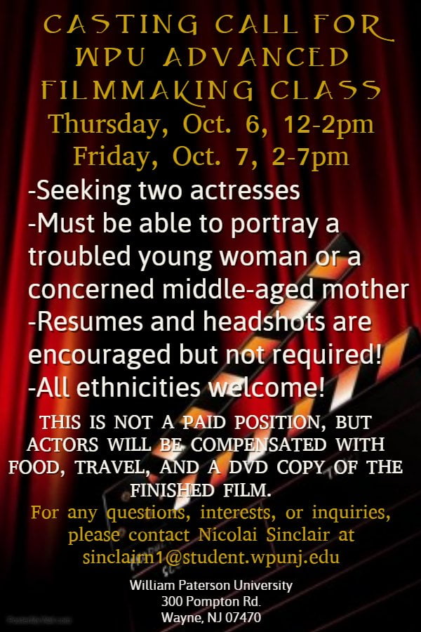 This casting notice was posted by: William Paterson University- Advanced Film Class