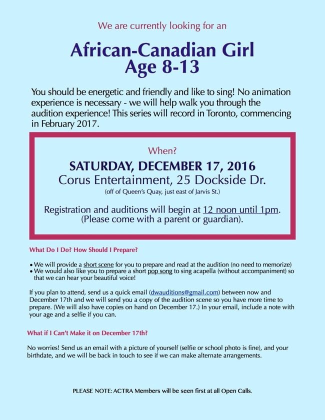 We are currently looking for an African-Canadian Girl, age 8-13 to play a leading role in a new animated television series.