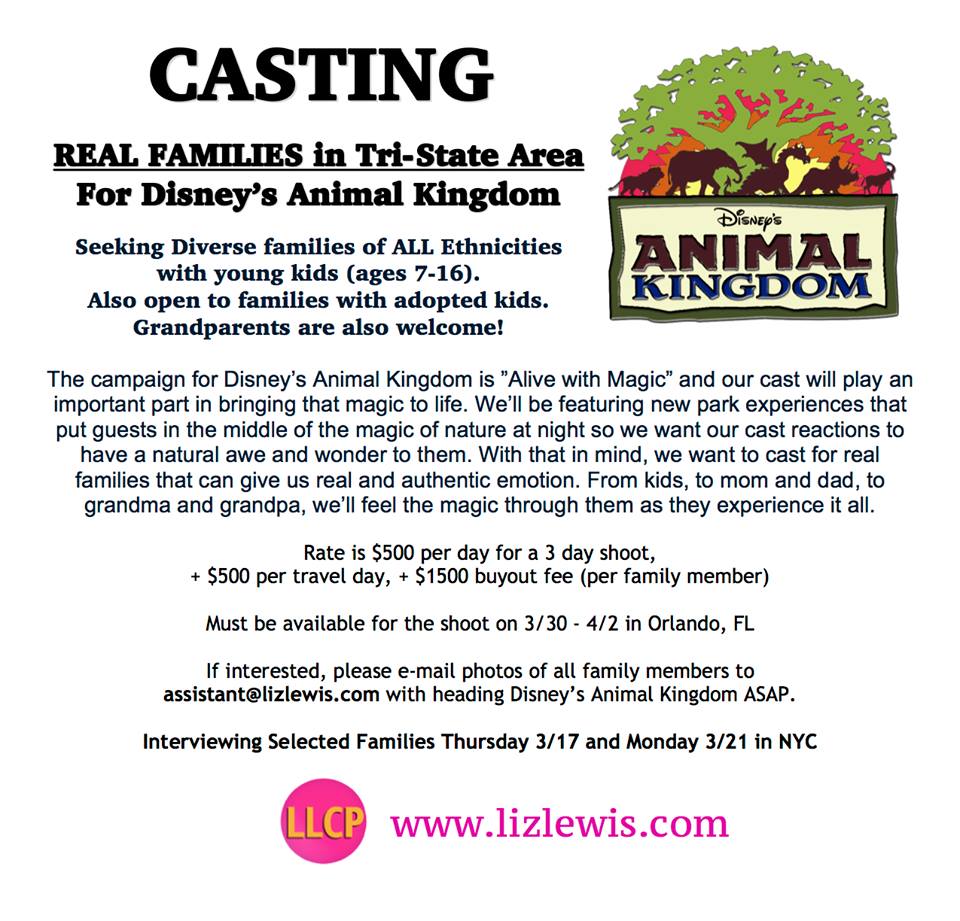 If you live in the NYC area yo may be in luck. Liz Lewis casting is looking for diverse families of all ethnicities who have kids between the ages of 7 and 16. The Disney promo casting directors are looking for families which include grandparents as well. The spot is for Disney’s Animal Kingdom “Alive with Magic” campaign and families will be filmed at Disney’s theme park in Orlando Florida. The families will be filmed experiencing the Disney magic. They will be featured experiencing new park experiences and should be able to express some awe. The Disney spot is only looking to cast REAL families, not actors acting like a family. The Disney company wants moms, dads, their kids and even their grandparents so that authentic emotion comes through in the shoot.