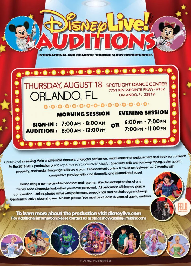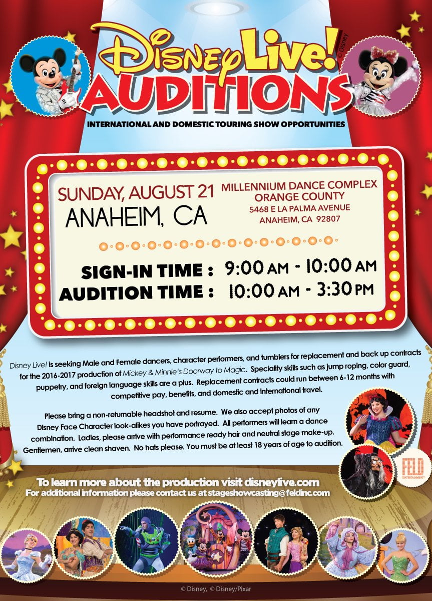 Disney Live! is a live stage show featuring beloved Disney characters. Casting directors for the Disney show will be coming to Orlando Florida and Anaheim California to hold auditions for professional performers to join the Disney show.