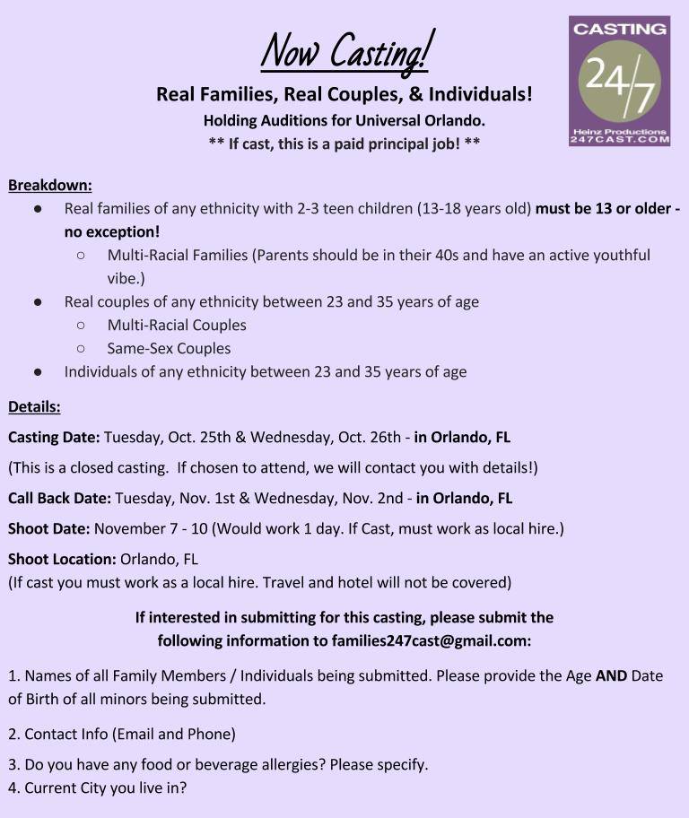 The Universal project is looking to cast a variety of families with kids that are at least 13 years of age. The project is also looking to cast real couples where both partners are between 23 and 35 years of age. These auditions are for principal roles and talent cast for the spot will be paid principal rates.