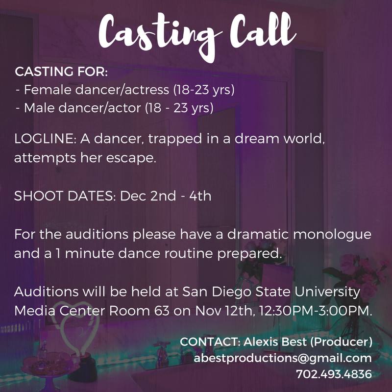 Auditions will be held at San Diego State University Media Center Room 63 on Nov 12th 12:30-3:00PM.