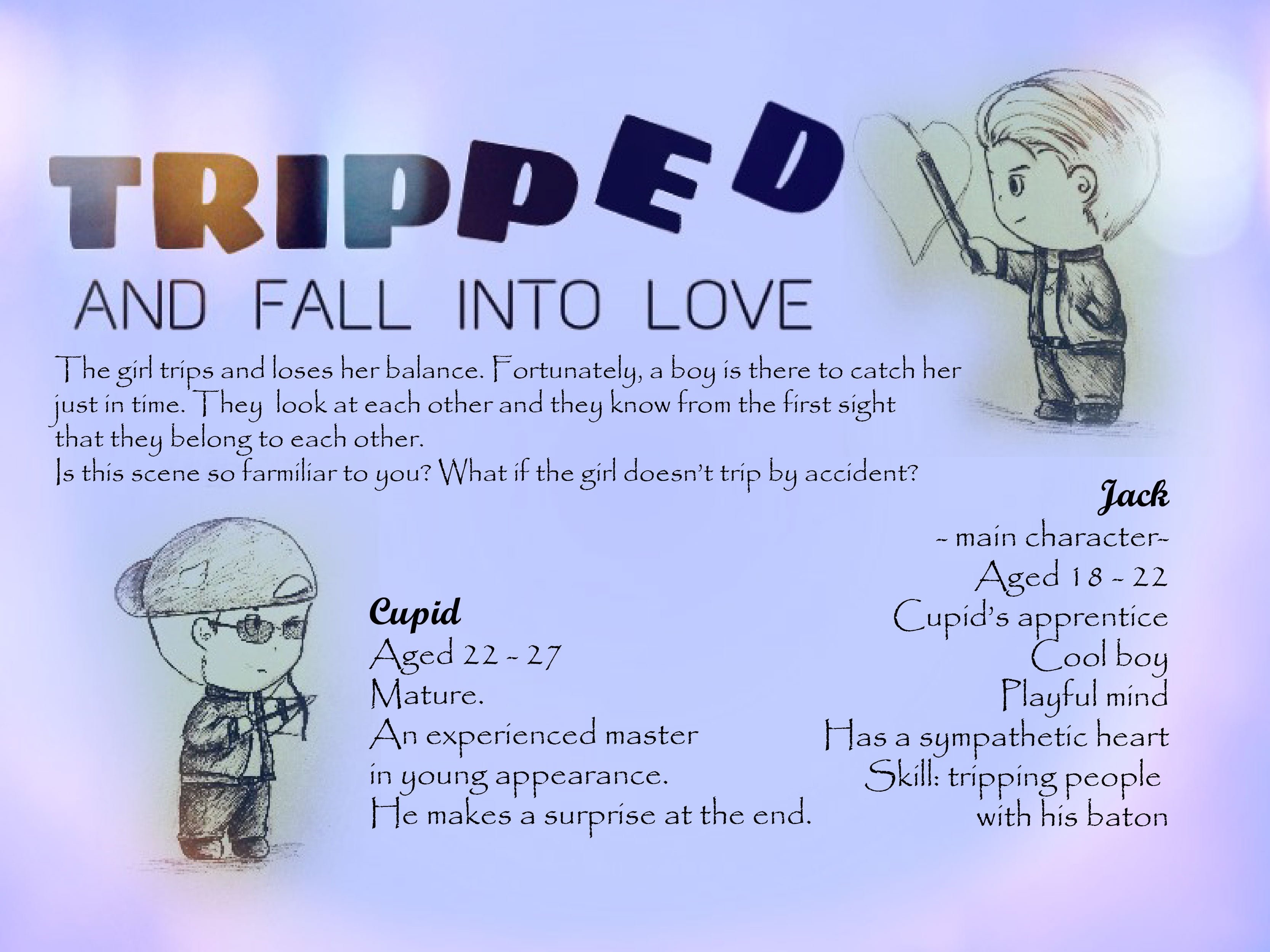 Jack is Cupid’s apprentice. His technique, differs from his master’s, is tripping people up so that they FALL in love with each other. After having paired up many couples, Jack feels lonely because he doesn’t have a love one for himself. One day, he has crush on a girl, but she, like every normal people, cannot see him. He’s frustrated and gets lack of attention for his job. He pairs up wrong people which leads to some troubles.