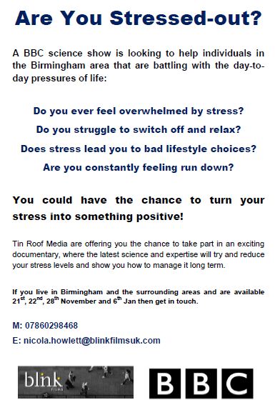 We’re after people from Birmingham and the surrounding areas (an hours drive of Birmingham) that suffer from stress caused by day to day life and consequently would like the opportunity to learn how to manage it.