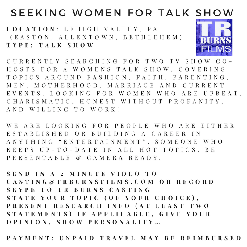 CURRENTLY SEARCHING FOR TWO TV SHOW CO-HOSTS FOR A WOMENS TALK SHOW. COVERING TOPICS AROUND FASHION, FAITH, PARENTING, MEN, MOTHERHOOD, MARRIAGE AND CURRENT EVENTS. LOOKING FOR WOMEN WHO ARE UPBEAT, CHARISMATIC, HONEST WITHOUT PROFANITY, AND WILLING TO WORK!