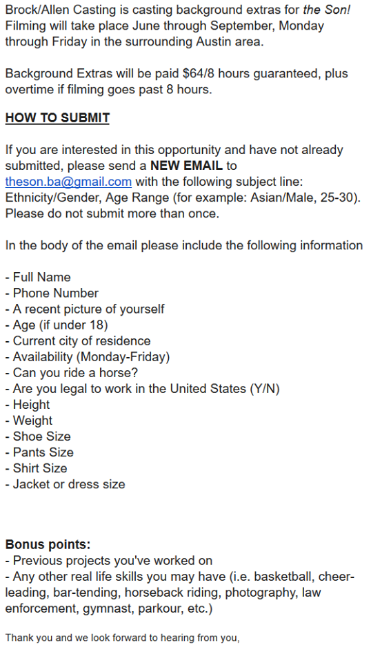 The show recently held an open casting call for “The Son“ and is still accepting submissions via email. The series is set in the old west so knowing how to ride a horse may be a plus.