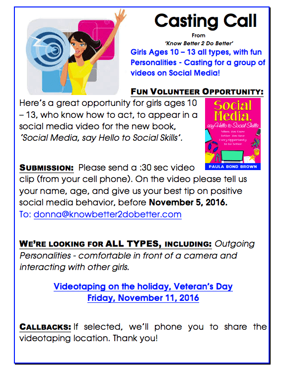 Fun Volunteer Opportunity: Here’s a great opportunity for girls ages 10 – 13, who know how to act, to appear in a social media video for the new book,