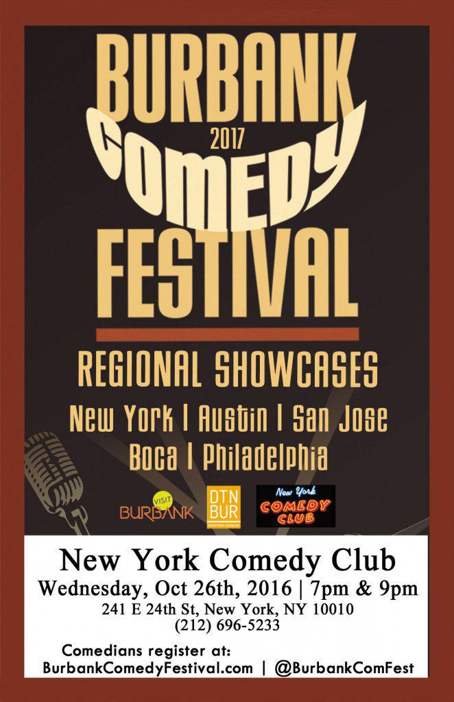 Do you think you’re funny? Show us your comedy chops! Producers will be traveling to major cities across the US, auditioning local talent, and inviting selected comedians to appear in the 3rd Annual Burbank Comedy Festival at Flappers Comedy Club and Restaurant in Downtown Burbank Aug 13-19, 2017. We will be in NEW YORK CITY on October 26th for TWO showcases– 7pm & 9pm and we’re looking to book 25 comedians for each showcase!
