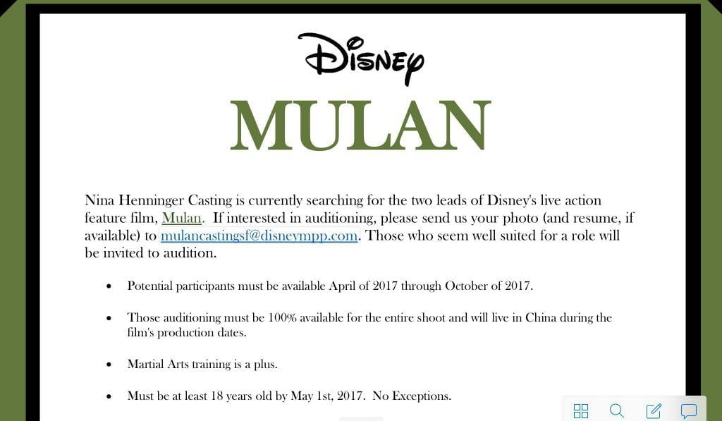 If you fit the character descriptions for Mulan and would like to tryout for the role, please see the casting notice below for the details on how to apply.