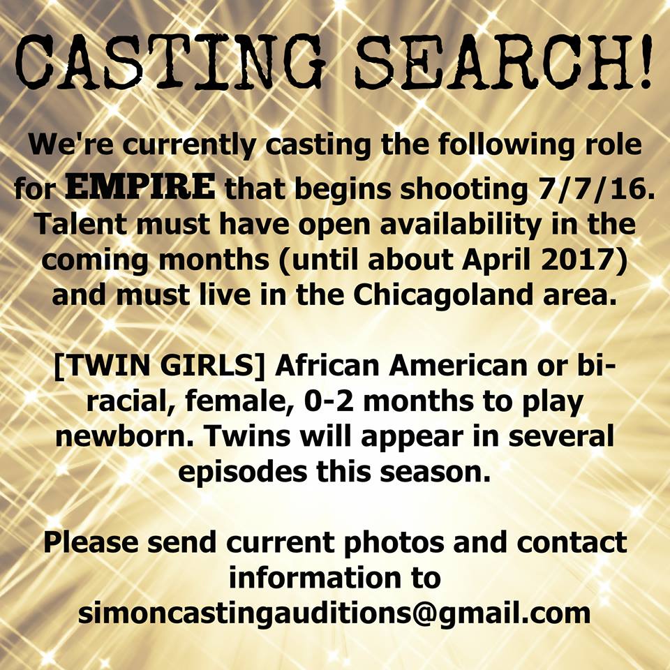 A baby casting call is out for “Empire.” The show is gearing up for production once again and the show’s casting directors have a casting call out for twin baby girls in the Chicagoland area.
