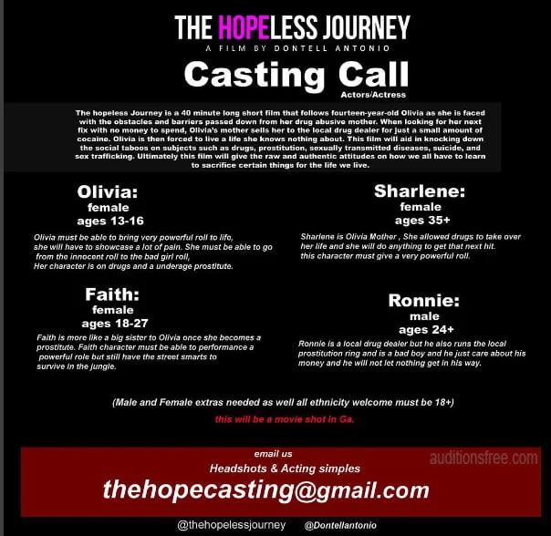 We are Casting for Olivia, Faith, Sharlene, Ronnie. See flyer for more information on Character.
