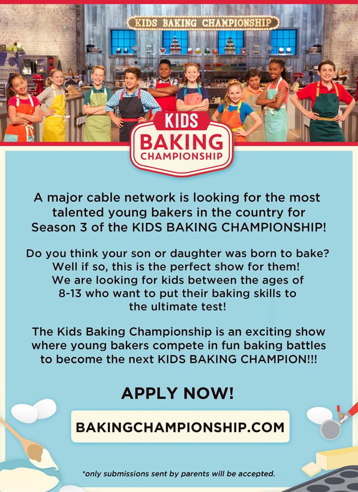 A major cable network is looking for the most talented young bakers in the country for Season 3 of the KIDS BAKING CHAMPIONSHIP!