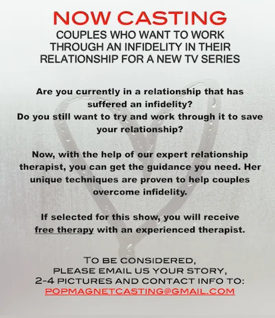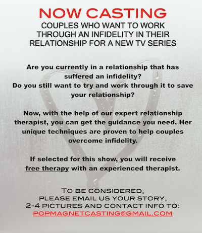 NOW CASTING – COUPLES WHO WANT TO WORK THROUGH AN INFIDELITY IN THEIR RELATIONSHIP FOR A NEW TV SERIES ON A MAJOR NETWORK CABLE NETWORK.
