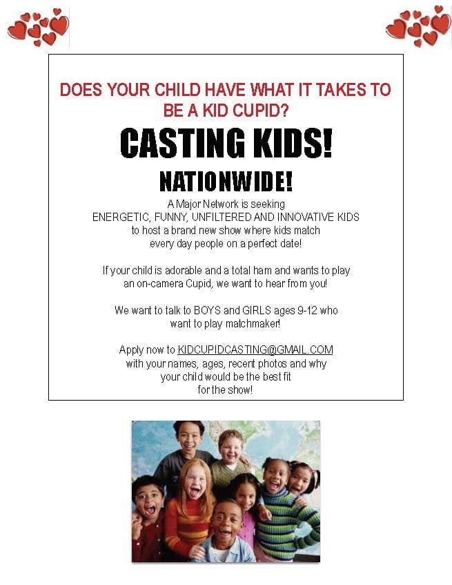 Can your adorable kid play matchmaker? An upcoming TV show is holding auditions for kids who like to play kid cupid and host a new reality show. The show is seeking fun, energetic, funny and innovative kids to host a brand new show where kids match everyday people with a perfect date. If your kid loves the camera, is a huge ham and would love to play an on-camera kid cupid, producers would love to hear all about it.