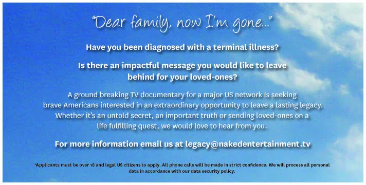 A ground breaking TV documentary for a major US network is seeking brave Americans interested in an extraordinary opportunity to leave a lasting legacy. Whether it’s an untold secret, an important truth or sending loved-ones on a life fulfilling quests we would love to hear from you.