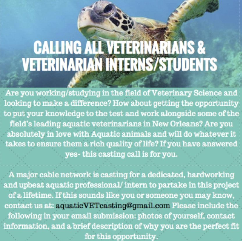 Are you working/studying in the field of Veterinary Science and looking to make a difference? How about getting the opportunity to put your knowledge to the test and work alongside some of the field’s leading AQUATIC VETERINARIANS in New Orleans, LA? Are you absolutely in love with AQUATIC ANIMALS and will do whatever it takes to ensure them a rich quality of life? If you have answered yes– this casting call is for you.