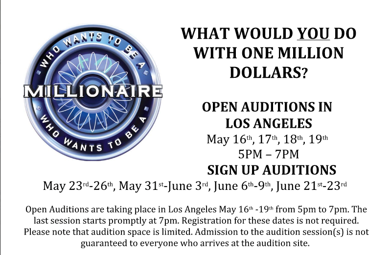 This casting notice was posted by: Who Wants to be a Millionaire Season 15