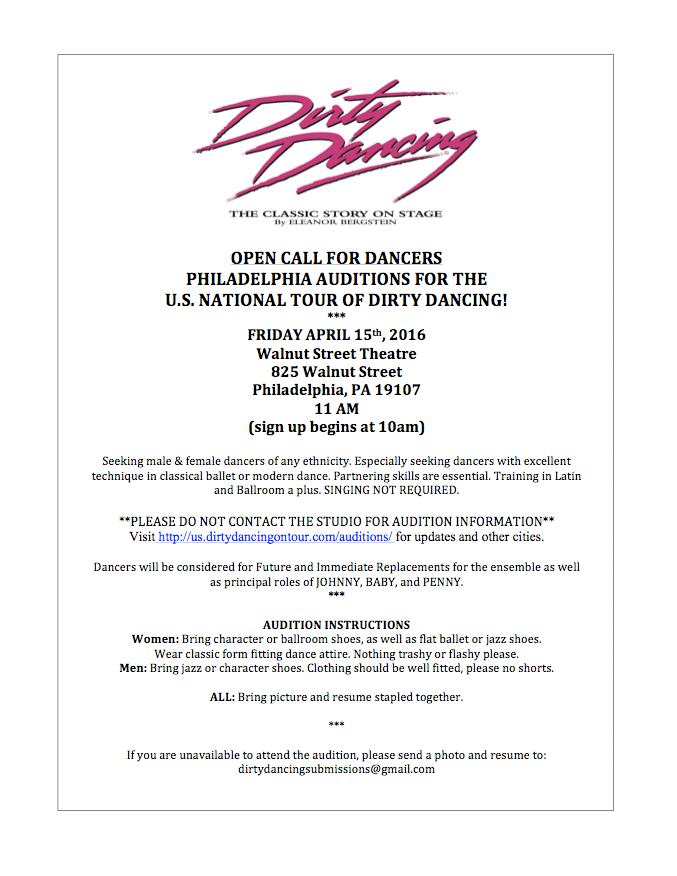 If you are unavailable to attend the audition, please send a photo and resume to: dirtydancingsubmissions@gmail.com